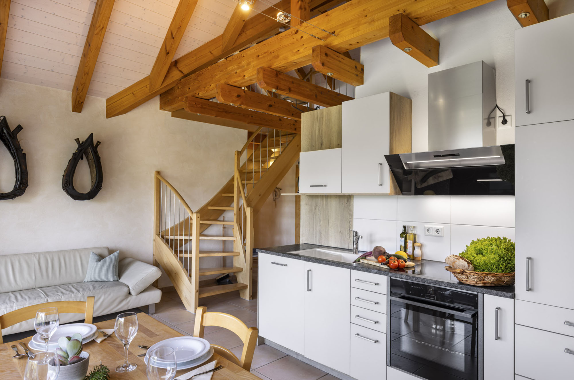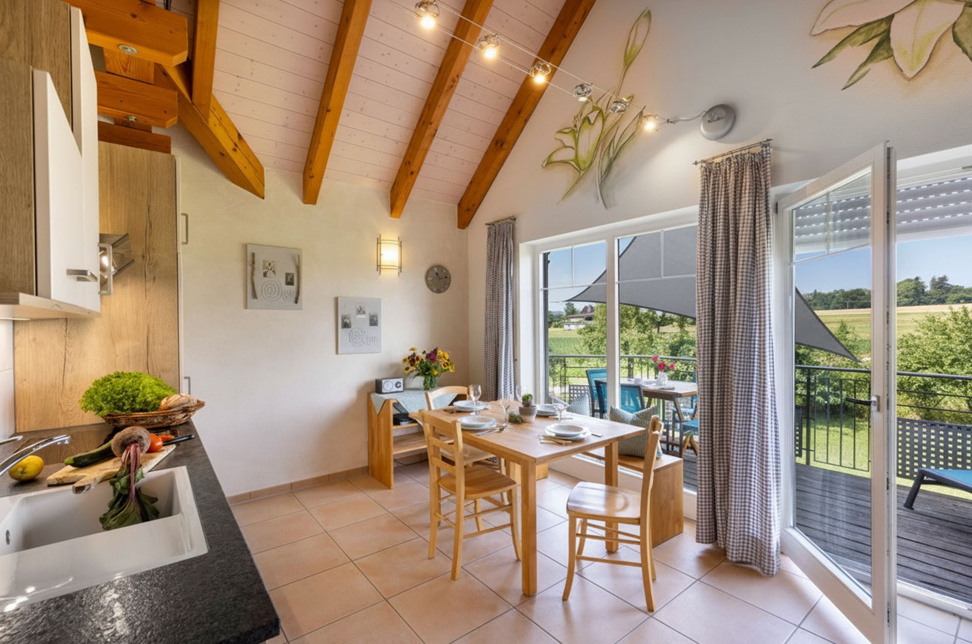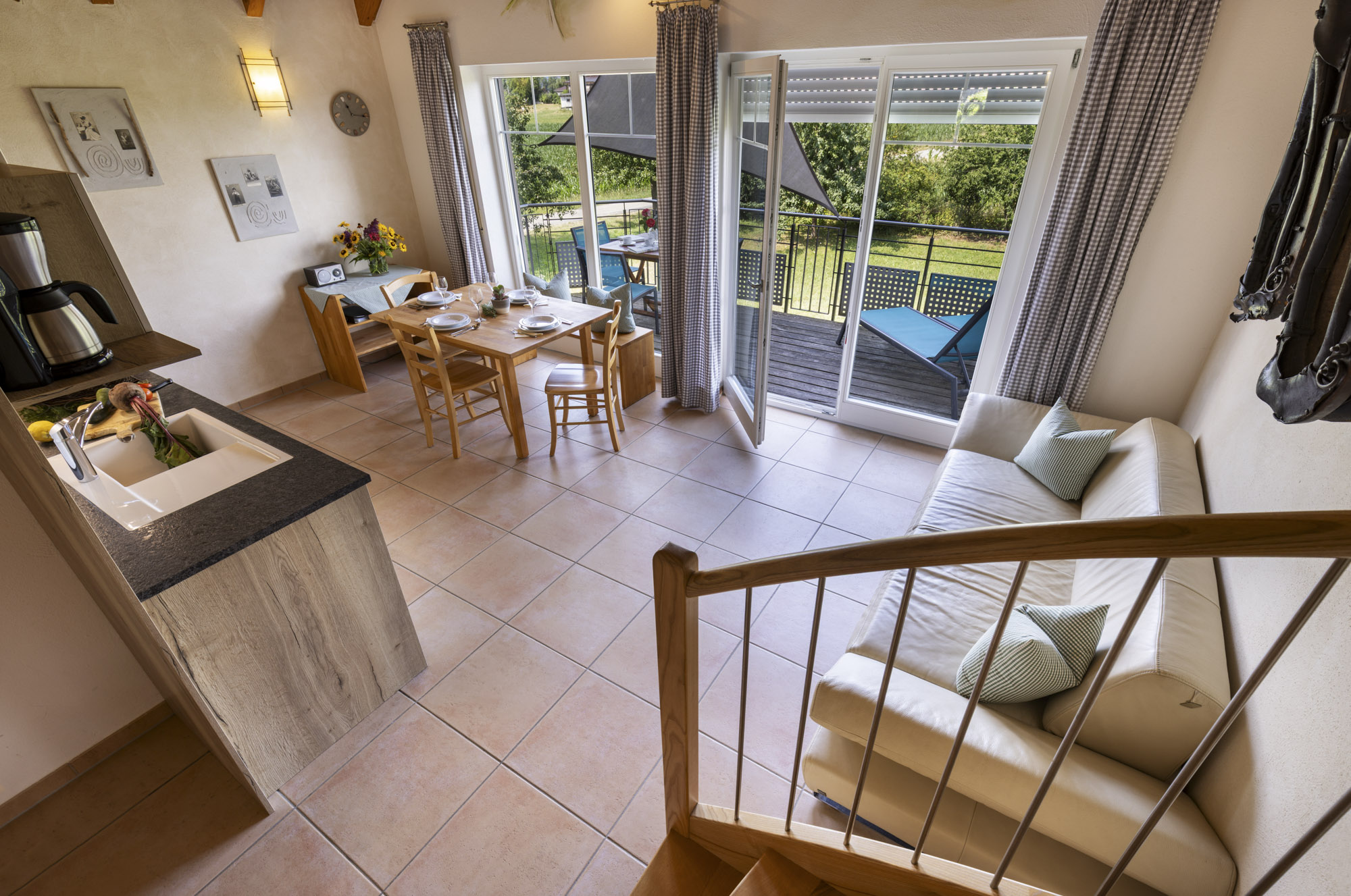 Die Grundfläche der Ferienwohnung ist durch Dachschrägen in der Galerie wesentlich größer als die schon große Wohnfläche von 77m². Direkt an den Essbereich mit Glasfront schließt sich der großzügige Balkon an, der zur Abendsonne ausgerichtet ist und im Sommer euch dazu einlädt, bei einem Glas Wein den Sternenhimmel zu genießen. Im Essbereich führt eine Treppe aus Eschenholz vom eigenen Wald direkt in die Galerie, wo ihr ein Sofa mit Flachbildschirm vorfindet. Die massiven Holzmöbel, wie auch die Treppe sind zum größten Teil von unseren tüchtigen, regionalen Schreinern gefertigt worden.