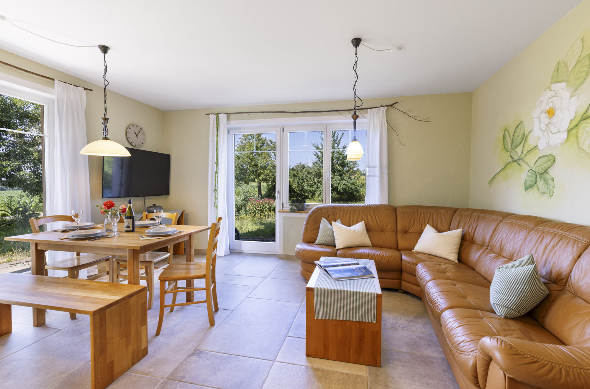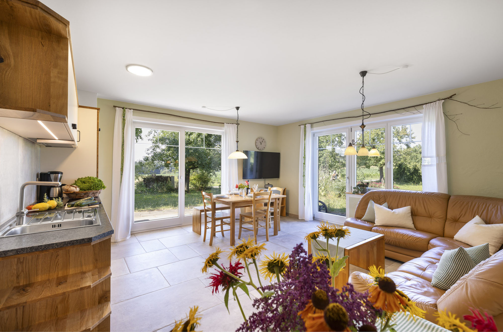 Unsere Ferienwohnung „Rose“ mit ihren 60m² befindet sich ebenerdig und fahrstuhlgeeignet im Erdgeschoss des Ferienhaus „Blumenstrauß“. Der offene Wohnraum bietet mit großen Fenster und Fußbodenheizung eine gute Wohlfühl-Atmosphäre. Die massiven Holzmöbel sind zum größten Teil von unseren tüchtigen, regionalen Schreinern gefertigt worden.