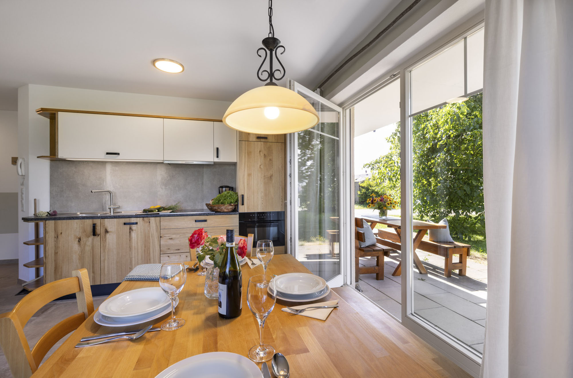 Mit einer großen, nach Süden ausgerichteter Terrasse, welche an die große Spiel- und Liegewiese angrenzt, könnt ihr auf euren Sonnenliegen entspannt die Urlaubszeit genießen.