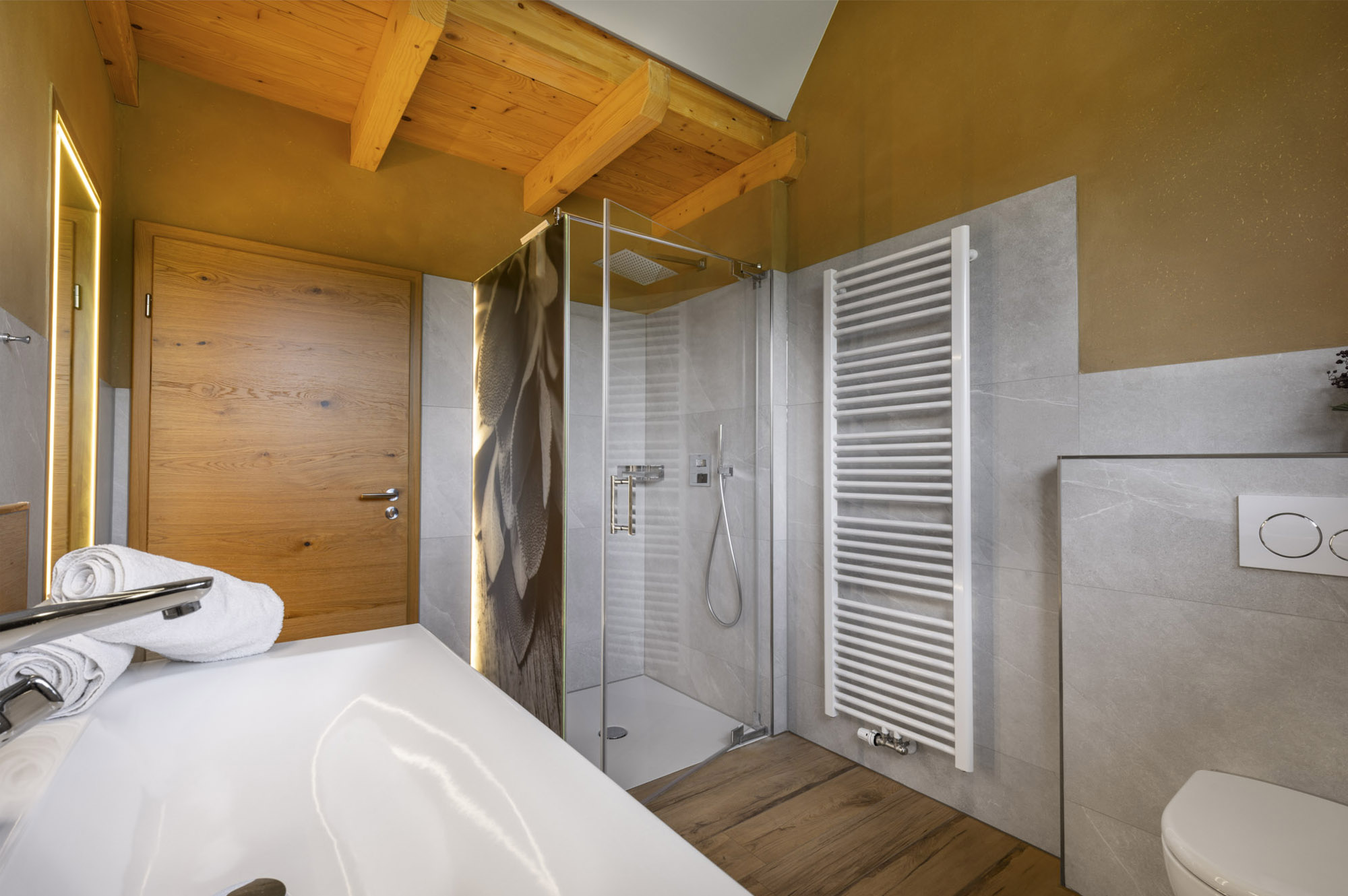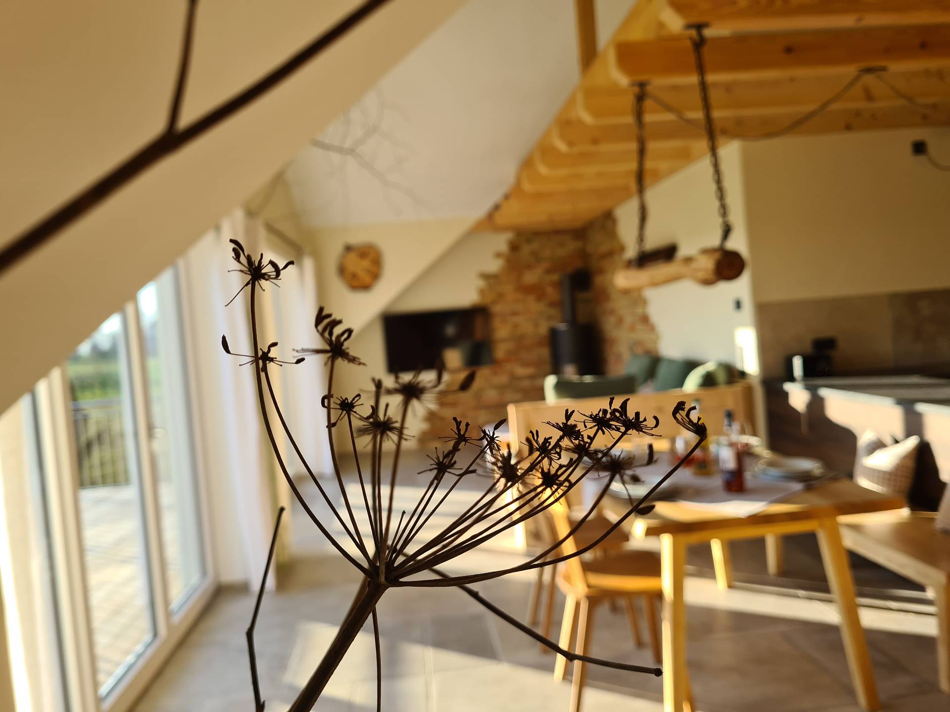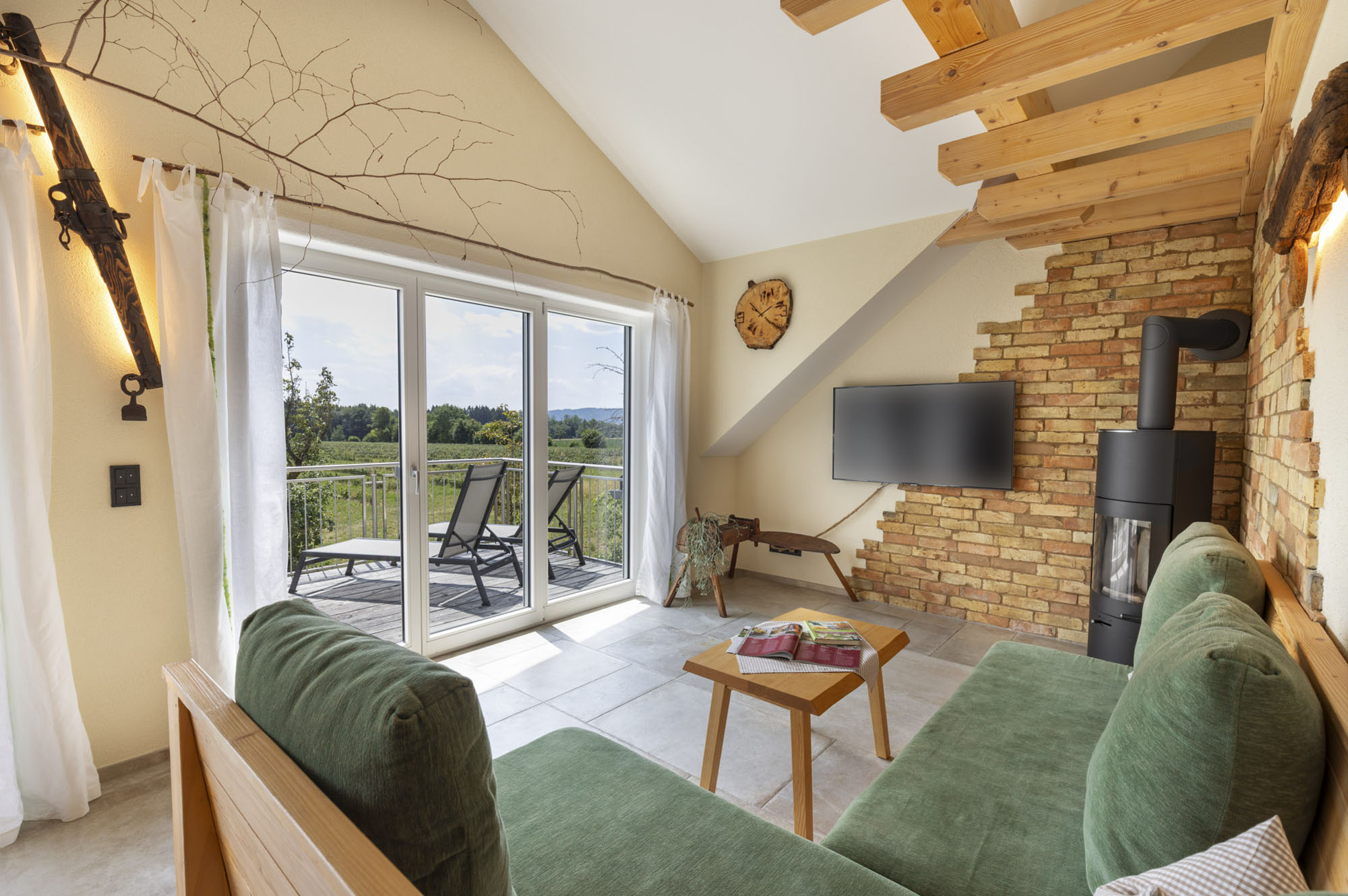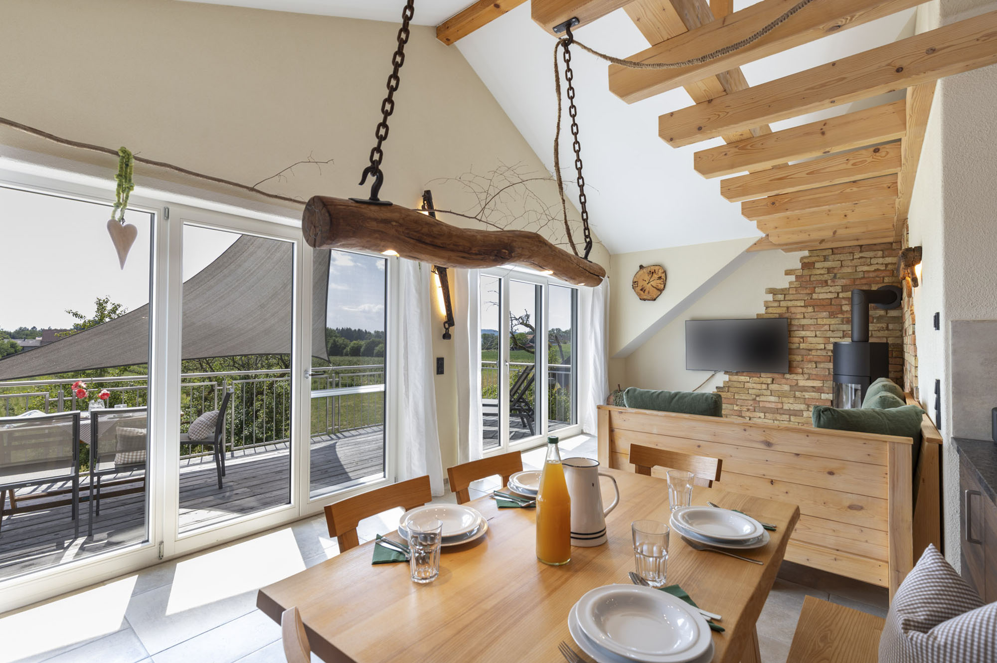 Dieser Satz passt sehr gut zu unserer 97m² großen Wohnung, welche mit ihren natürlichen Baustoffen einen besonderen Bezug zur Natur widerspiegelt. Die Wohnung ist mit sehr viel Holz aus dem eigenen Wald eingerichtet und eine Ziegelwand mit einem Kaminofen runden die Inneneinrichtung ab. Ein 17m² großer, zur Sonnenseite ausgerichteter Balkon lädt zum Entspannen und Durchatmen ein. Mit Blick in die Natur, zu den Tieren und auf die Spitzen der Alpen könnt ihr eure Gedanken schweifen lassen.