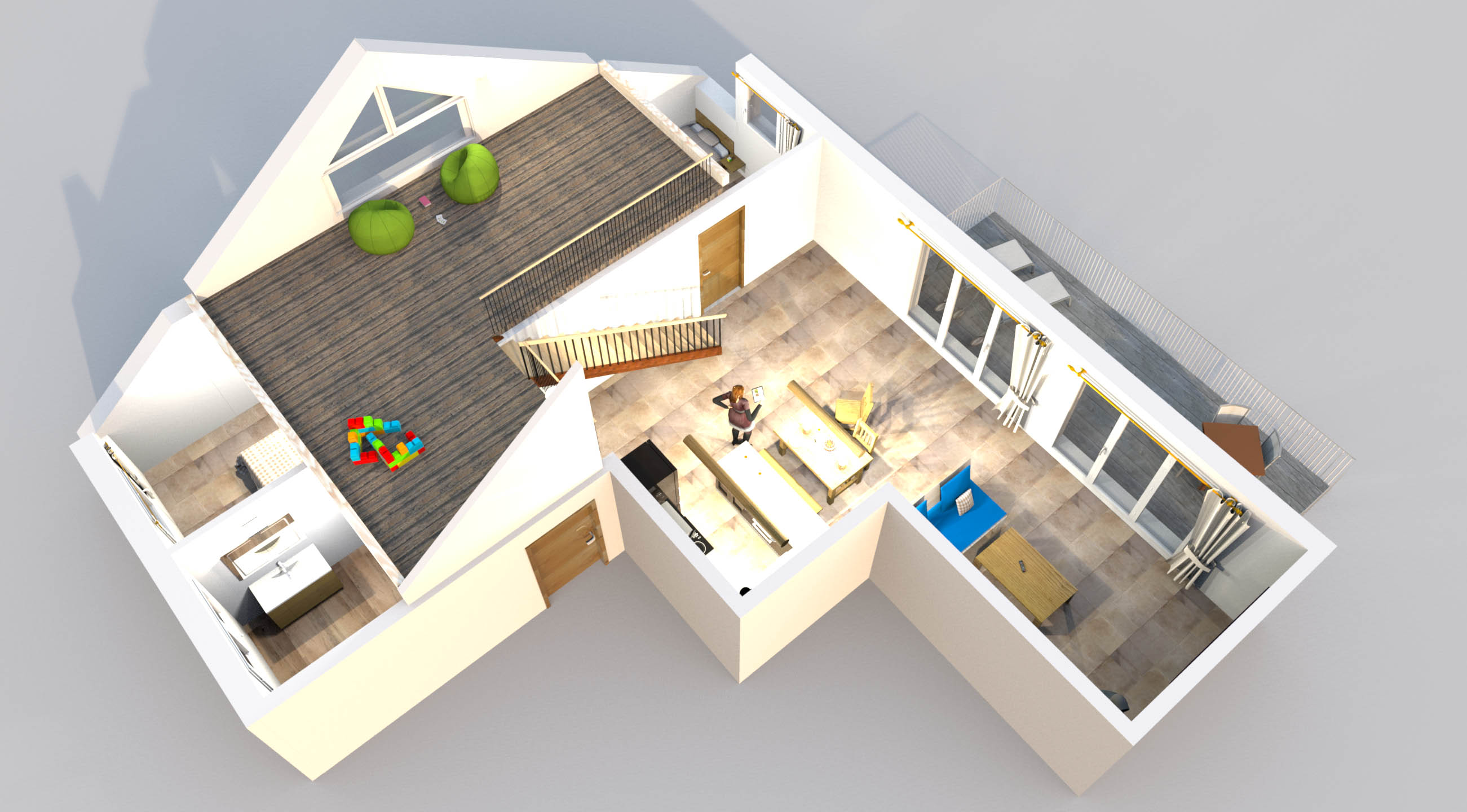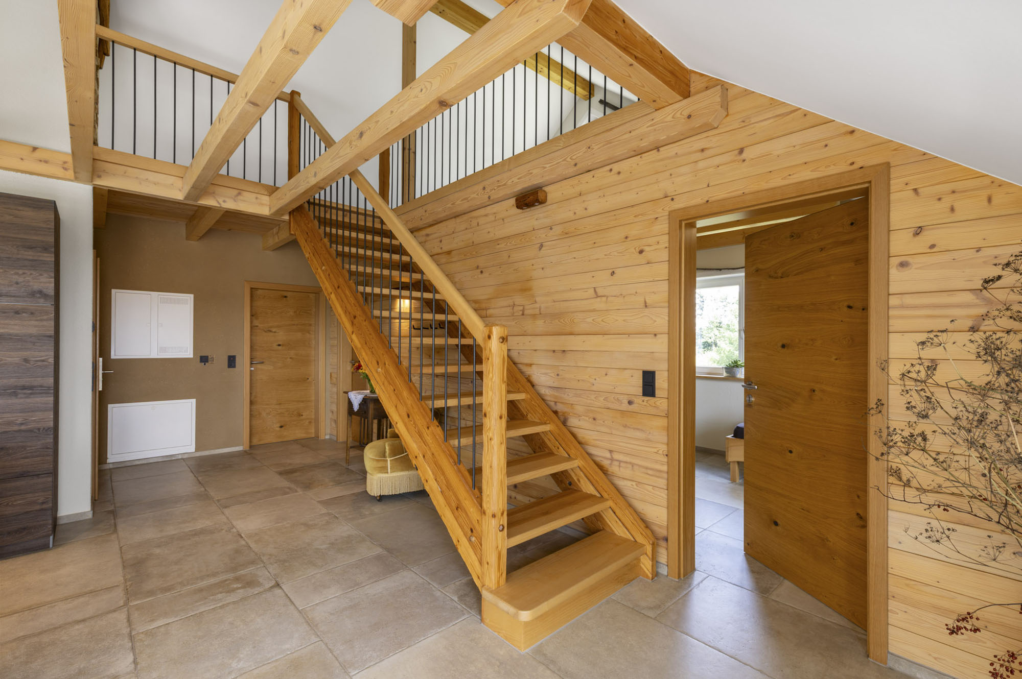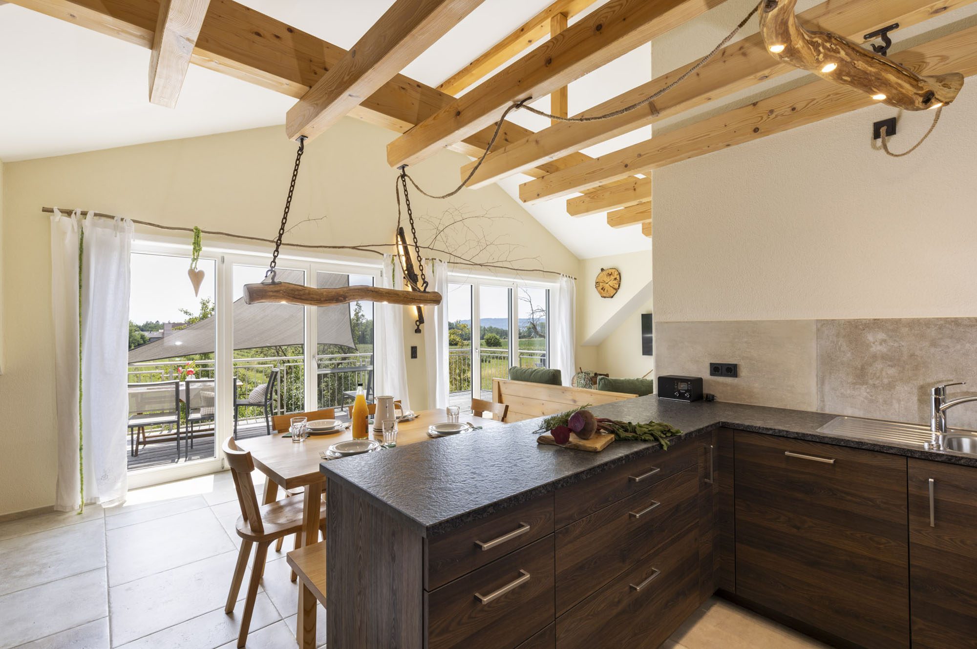 Die massiven Holzmöbel sind zum größten Teil aus eigenem Holz von unseren tüchtigen Schreinern gefertigt worden. Zusammen mit einer großen Glasfront zum Balkon und einer Fußbodenheizung sorgen sie für eine Wohlfühl-Atmosphäre. Alle Lampen aus Holz in dieser Wohnung sind Unikate und wurden von uns selbst gefertigt. Die rustikale Treppe im Wohnzimmer führt zu einer offenen Galerie.