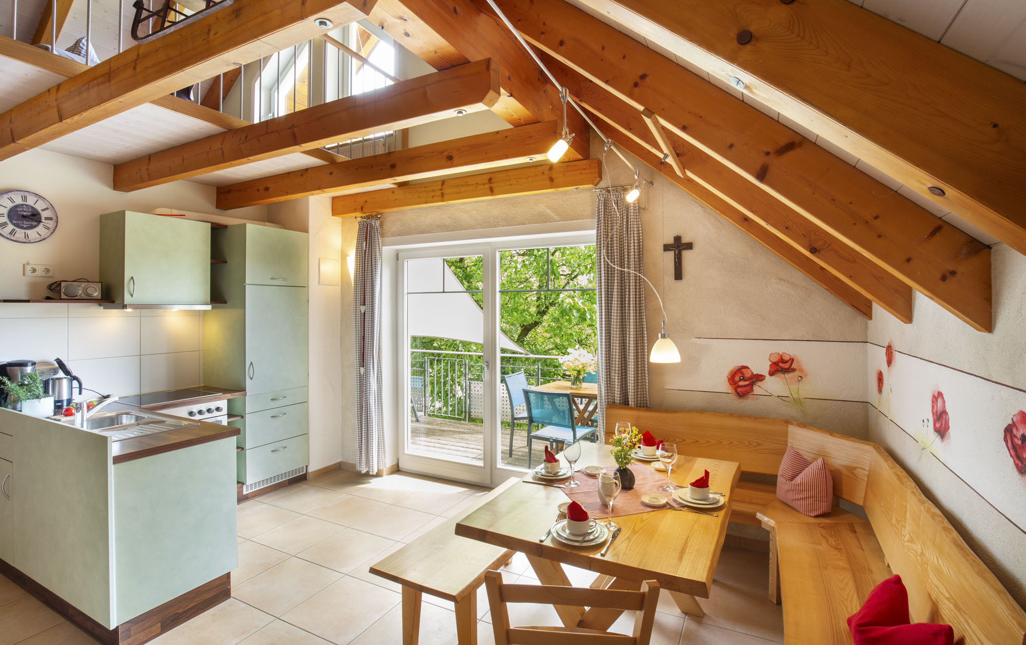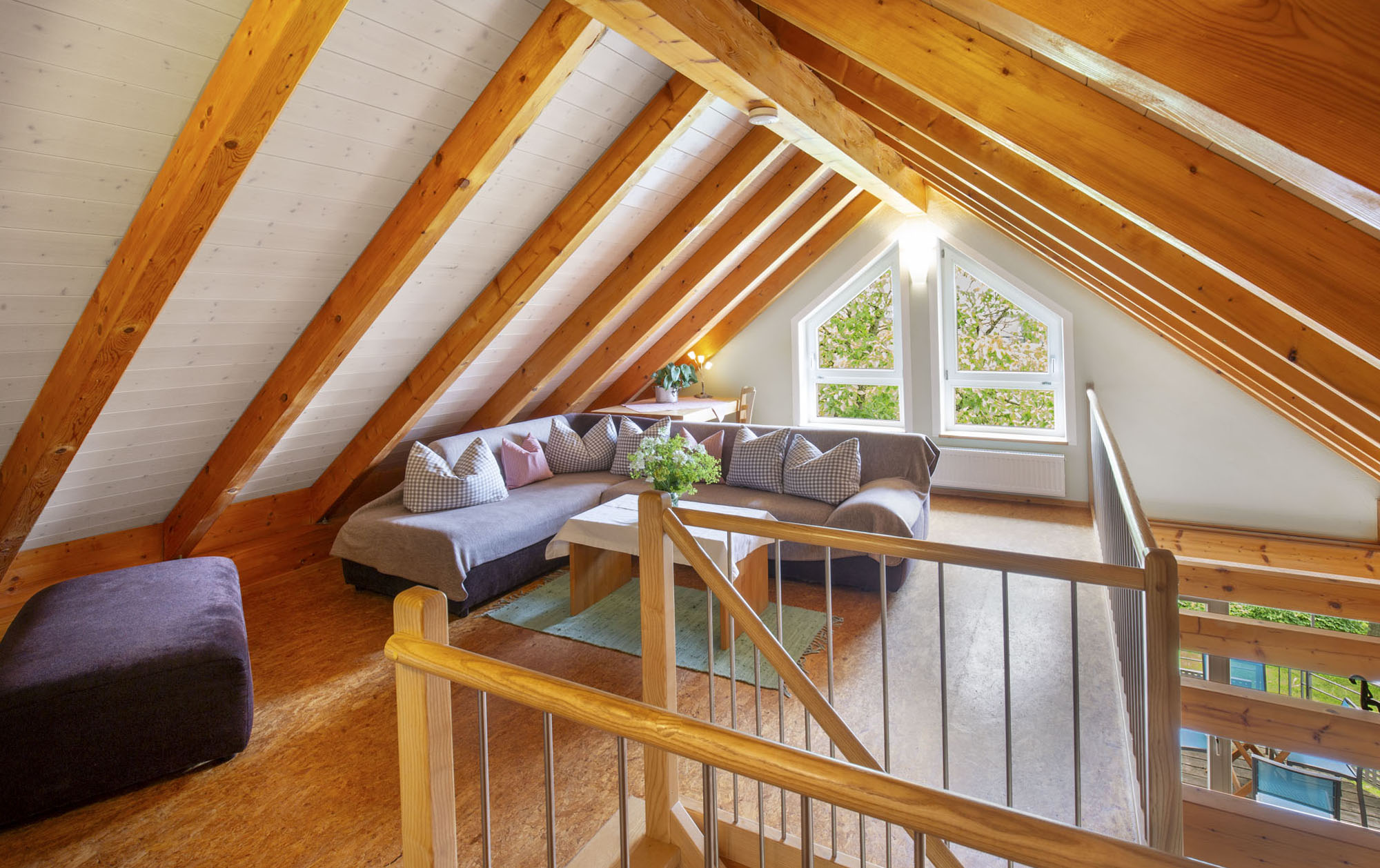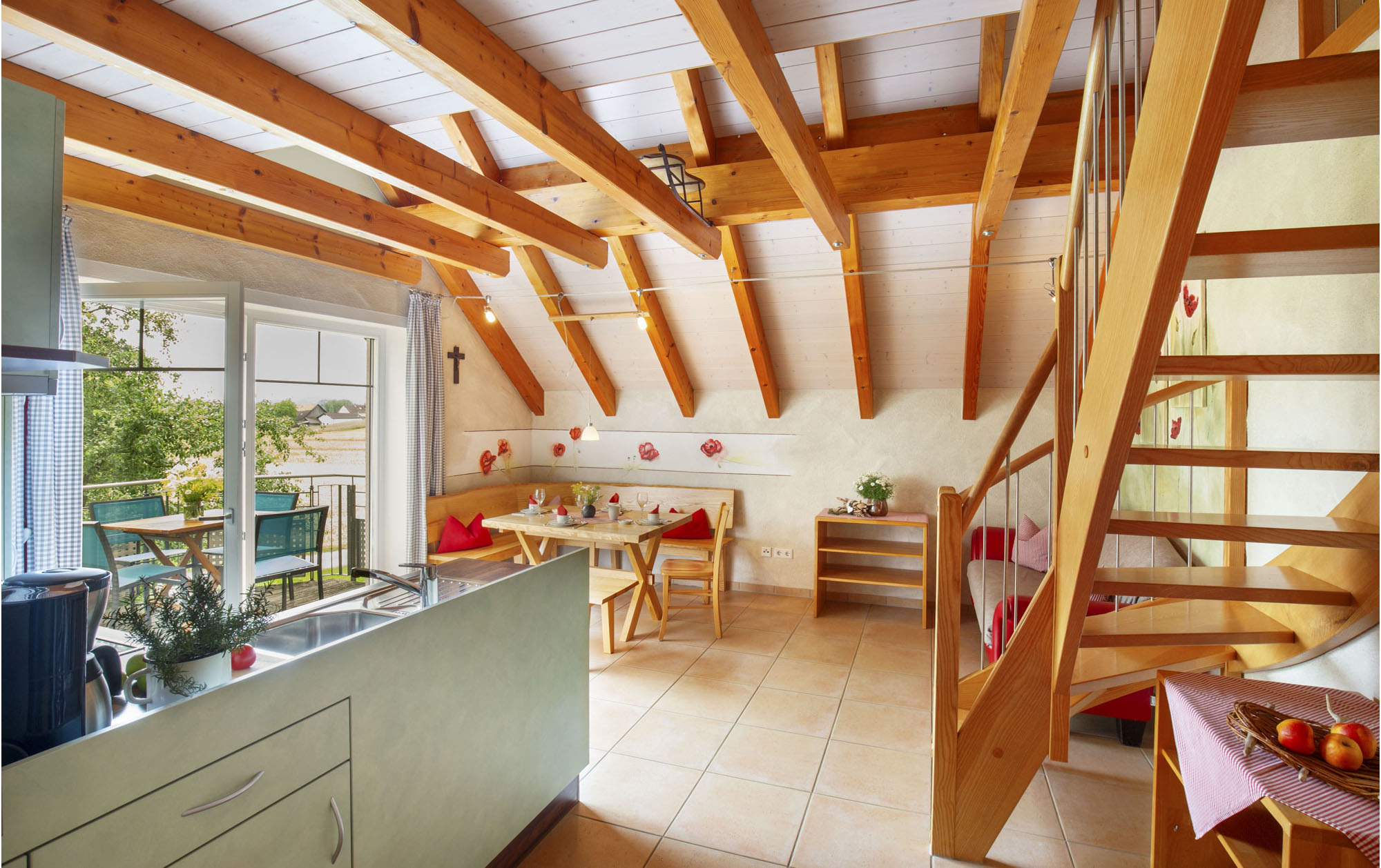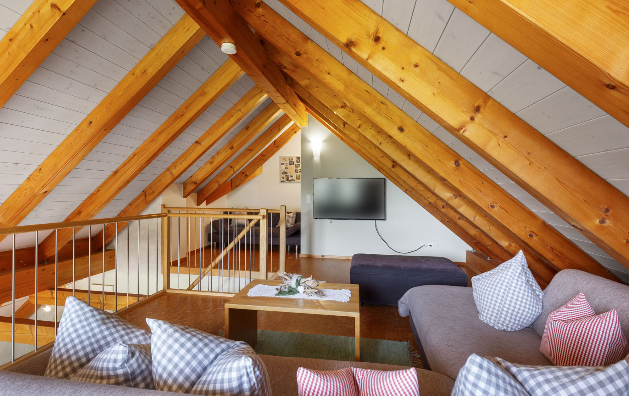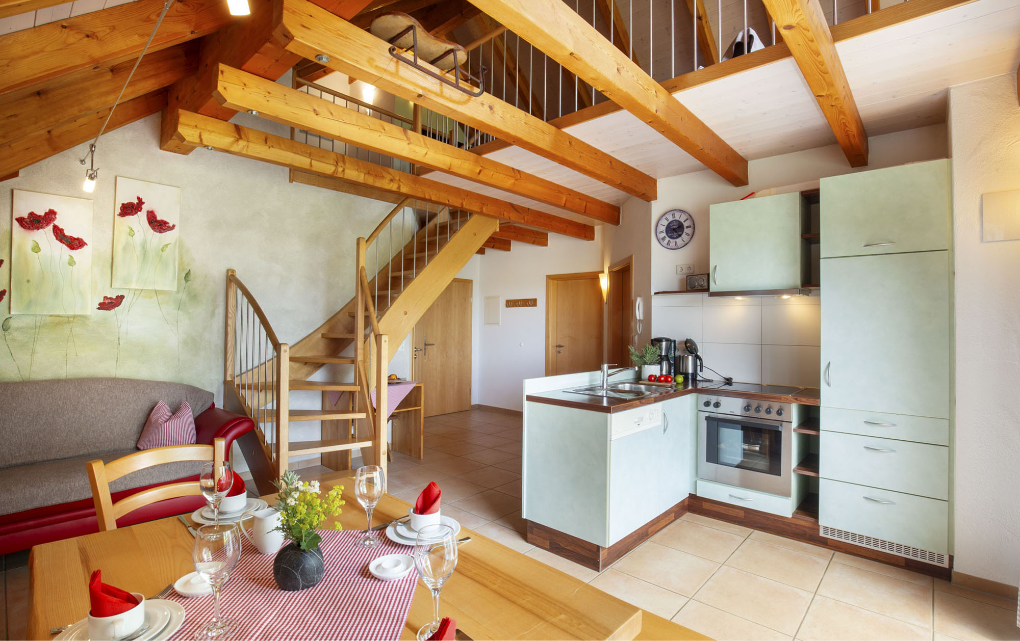 Unser Klatschmohn bietet euch auf ca.77m² Wohnraum alles was ihr für einen entspannten Urlaub braucht. Die Grundfläche der Wohnung ist wesentlich größer, wobei die Galerie mit ihrer gemütlichen Wohnlandschaft und dem Flachbildfernseher durch die charakteristischen Dachschrägen eine behagliche Atmosphäre erhält. Auch die Fußbodenheizung und das sichtbare Dachgebälk tragen zu dieser Atmosphäre bei. Bei guter Sicht kann man sogar von der Galerie aus die Alpen sehen. Die massive Treppe welche in die Galerie führt ist Esche aus dem eigenen Wald.