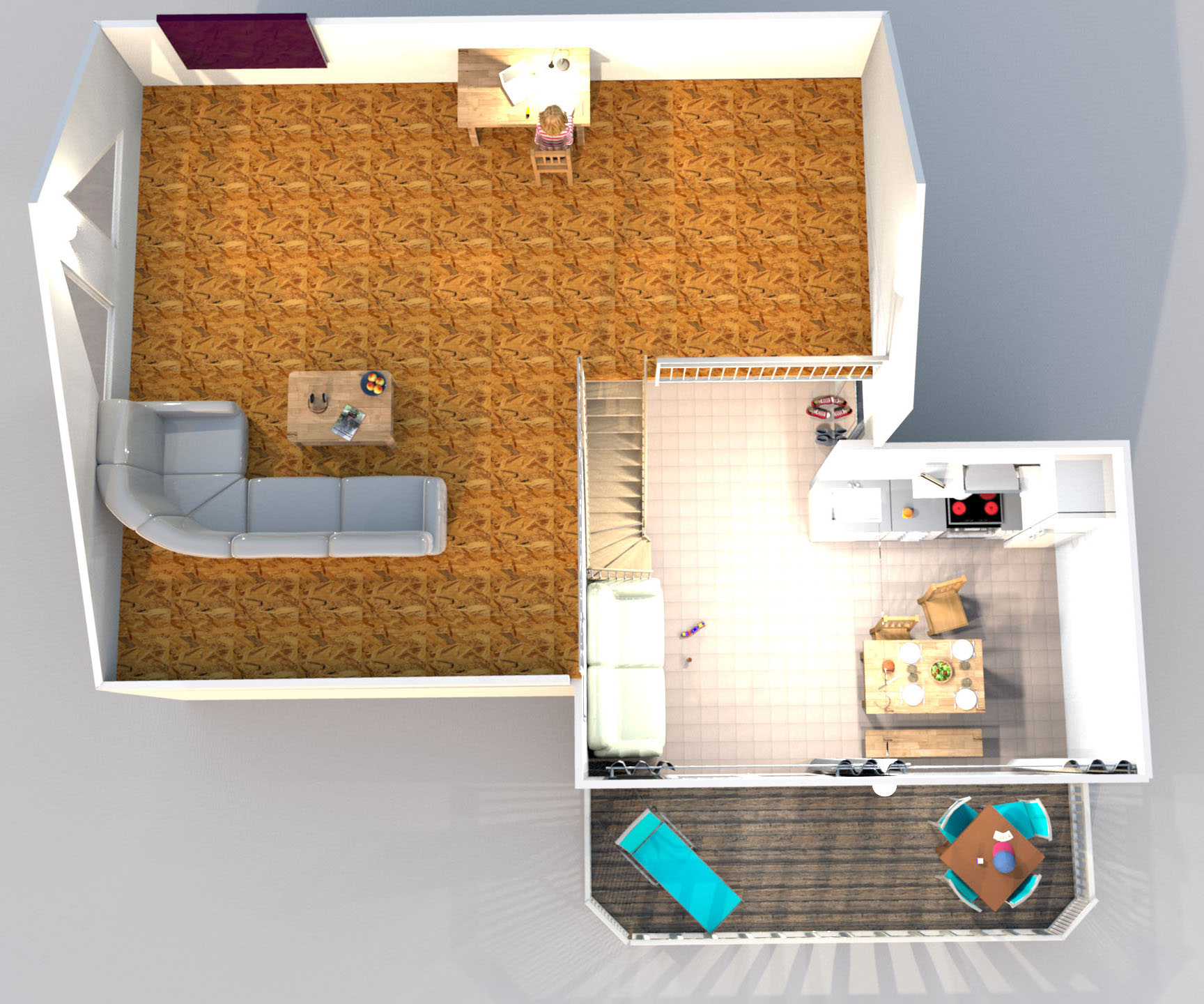 Die Grundfläche der Ferienwohnung ist durch Dachschrägen in der Galerie wesentlich größer als die schon große Wohnfläche von 77m². Direkt an den Essbereich mit Glasfront schließt sich der großzügige Balkon an, der zur Abendsonne ausgerichtet ist und im Sommer euch dazu einlädt, bei einem Glas Wein den Sternenhimmel zu genießen. Im Essbereich führt eine Treppe aus Eschenholz vom eigenen Wald direkt in die Galerie, wo ihr ein Sofa mit Flachbildschirm vorfindet. Die massiven Holzmöbel, wie auch die Treppe sind zum größten Teil von unseren tüchtigen, regionalen Schreinern gefertigt worden.