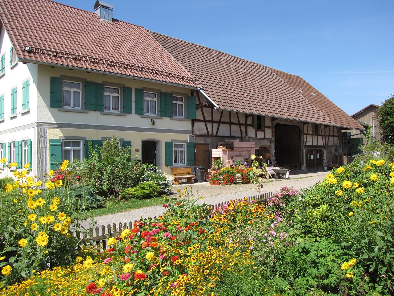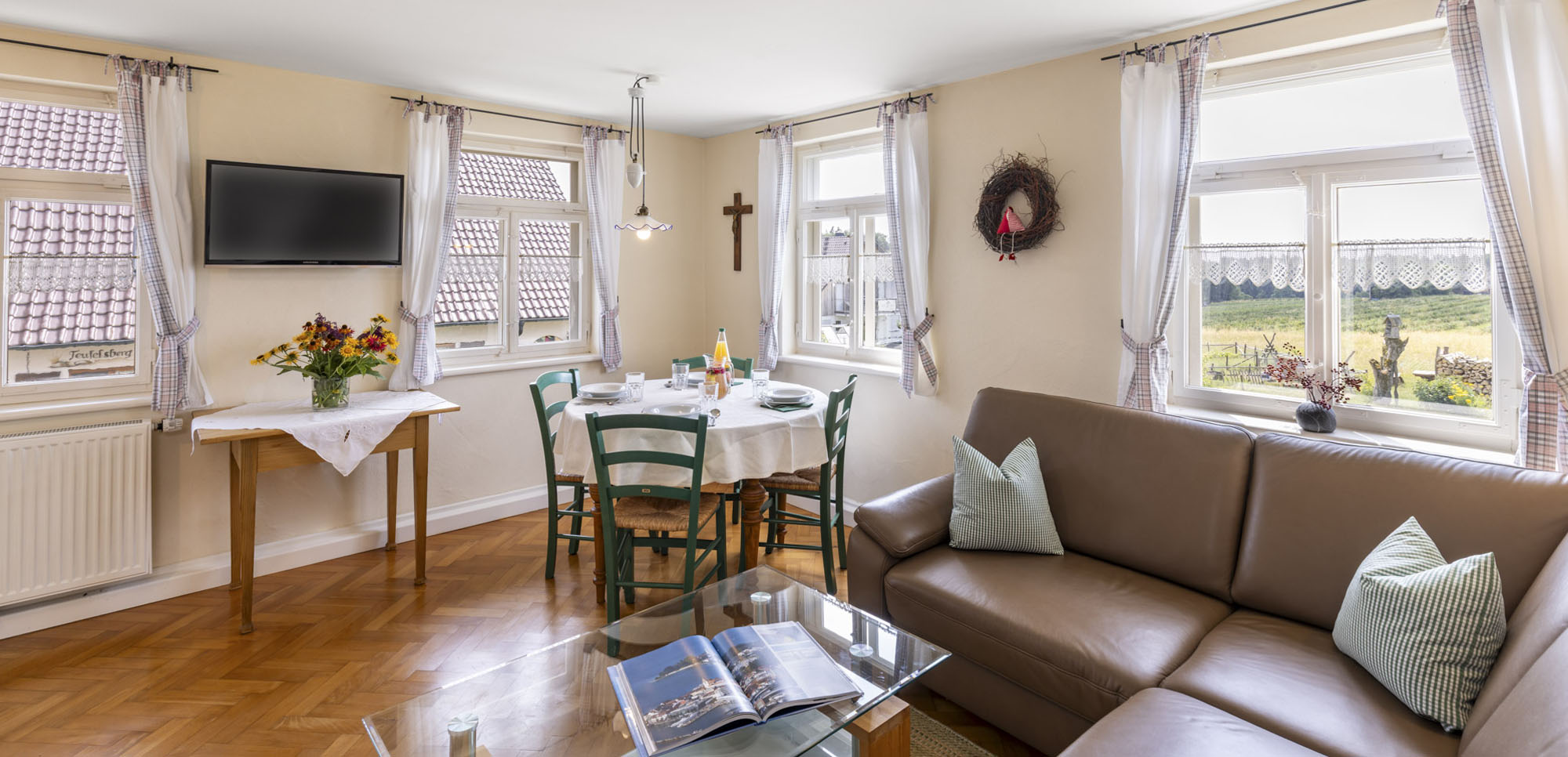 Das großzügige Badezimmer befindet sich direkt neben der Wohnung. Die Wohnung bietet durch seine Fenster im Wohnzimmer einen wunderbaren Blick in den alten Bauerngarten. Hier beginnt der Urlaub in der Ferienwohnung „Melisse“ – ruhig, authentisch und mit einem Hauch vergangener Zeiten.
