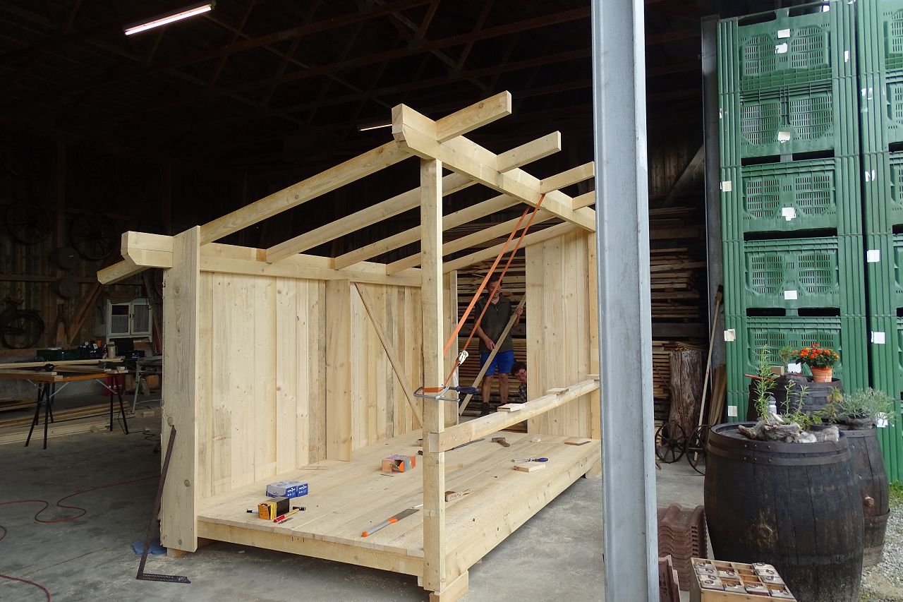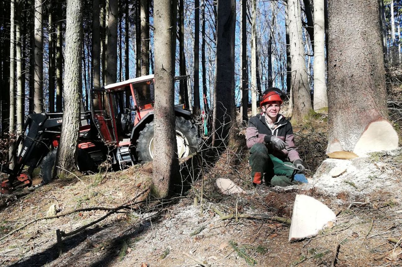 Neben der Landwirtschaft bewirtschaften wir außerdem noch Wald. Dieser liefert uns Bauholz, Bretter und Balken für Kinderspielhäuser, Wohnungen oder verschiedene andere Projekte, wie beispielsweise Vogelnisthilfen, Insektenhotels oder Hornissenkästen. Wir versuchen all das verbaute Holz auf dem Hof aus unserem eigenen zu fertigen, um lange Transportwege zu verhindern und damit einen direkten Einfluss auf eine schonende Waldbewirtschaftung zu erreichen. Die Bretter und Balken werden im benachbarten Ort von einer Sägerei verarbeitet. Pfähle für die Zäune der Tiere werden von uns aus zu eng stehenden, jungen Bäumen gefertigt.